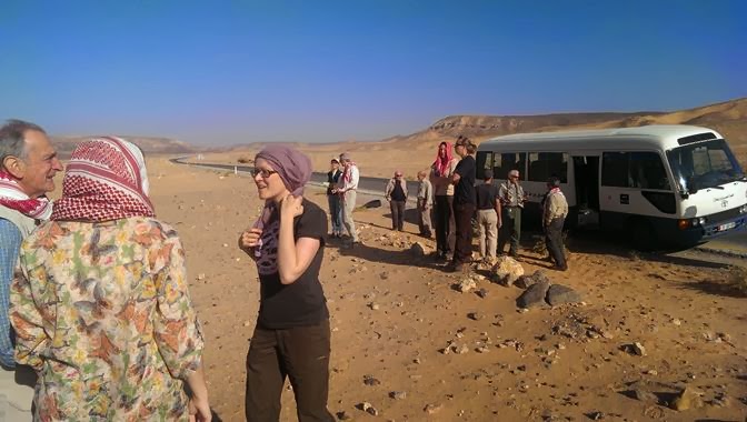 When we left at our usual 7.00 am this morning, the weather had changed. Much cooler, with a breeze and misty skylines prevailed as we headed down the road towards Mudawara. We stopped at Wadi Rutm station, a site we have visited many times before, to stretch our legs and show some of the newer team the station buildings. As you can see we were in a happy mood and looking forward to the day.